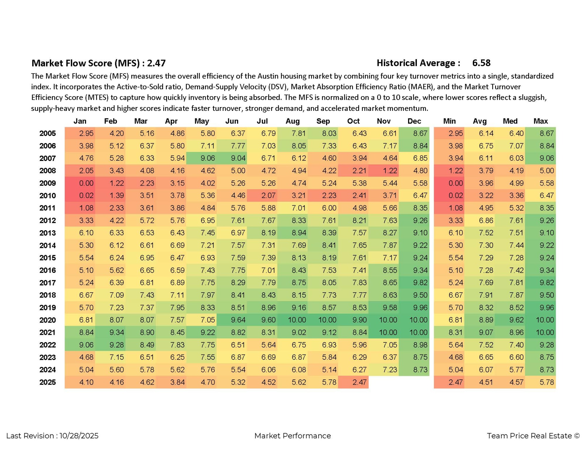 October 28,2025: In the Austin-area housing market, the recently defined Market Flow Score (MFS) is offering a clearer read on how swiftly homes are moving from listing to sale, and what that means for buyers and sellers. The MFS is a monthly index scaled from 0 to 10 that captures inventory absorption efficiency—how quickly active listings convert to pending or sold. A higher score signals strong buyer demand and fast turnover, while a lower score indicates slower activity, possible oversupply, or hesitant buyers. The formula behind the MFS blends metrics such as the Active-to-Sold ratio, Demand-Supply Velocity, Market Absorption Efficiency Ratio, and Market Turnover Efficiency Score, and then rescales these elements relative to historical minimum and maximum bounds to create a standardized index. A reading between 0.0 and 1.0 denotes a “Frozen Market,” 1.1-2.5 a “Slow Market,” 2.6-4.0 a “Frictional Market,” 4.1-5.5 a “Balanced Flow,” 5.6-7.5 an “Active Market,” and 7.6-10.0 an “Accelerated Market.”