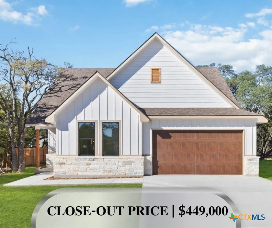 Exceptional lot. Finished construction. Compelling value—this modern farmhouse sits on an oversized 0.275-acre cul-de-sac street lot surrounded by mature oak trees. With a little over 2,000 sqft, you have 3 bedrooms, 2.5 baths, and a dedicated office with cathedral ceilings—a rare find at this price point. Striking curb appeal features an elevated roofline, stone-accented exterior, and covered front porch. Inside, the open-concept layout delivers clean, modern finishes with leathered granite countertops, soft pine cabinetry, and a statement chandelier anchoring the dining space. The main-level primary suite includes dual vanities, a frameless walk-in shower with bench and custom tile, private water closet, and a walk-in closet with custom shelving. Upstairs, two spacious secondary bedrooms are privately positioned with a full bath between them. Enjoy Hill Country living from the deep covered back patio overlooking a level yard with views of mature oaks. Added functionality includes a garage side door for easy yard access and a water softener loop. Located in Wimberley, with quick access to San Marcos, Dripping Springs, Canyon Lake, and Austin—approximately 25 minutes away. Close-out inventory. Exceptional lot. Reduced price. Schedule your private showing today.